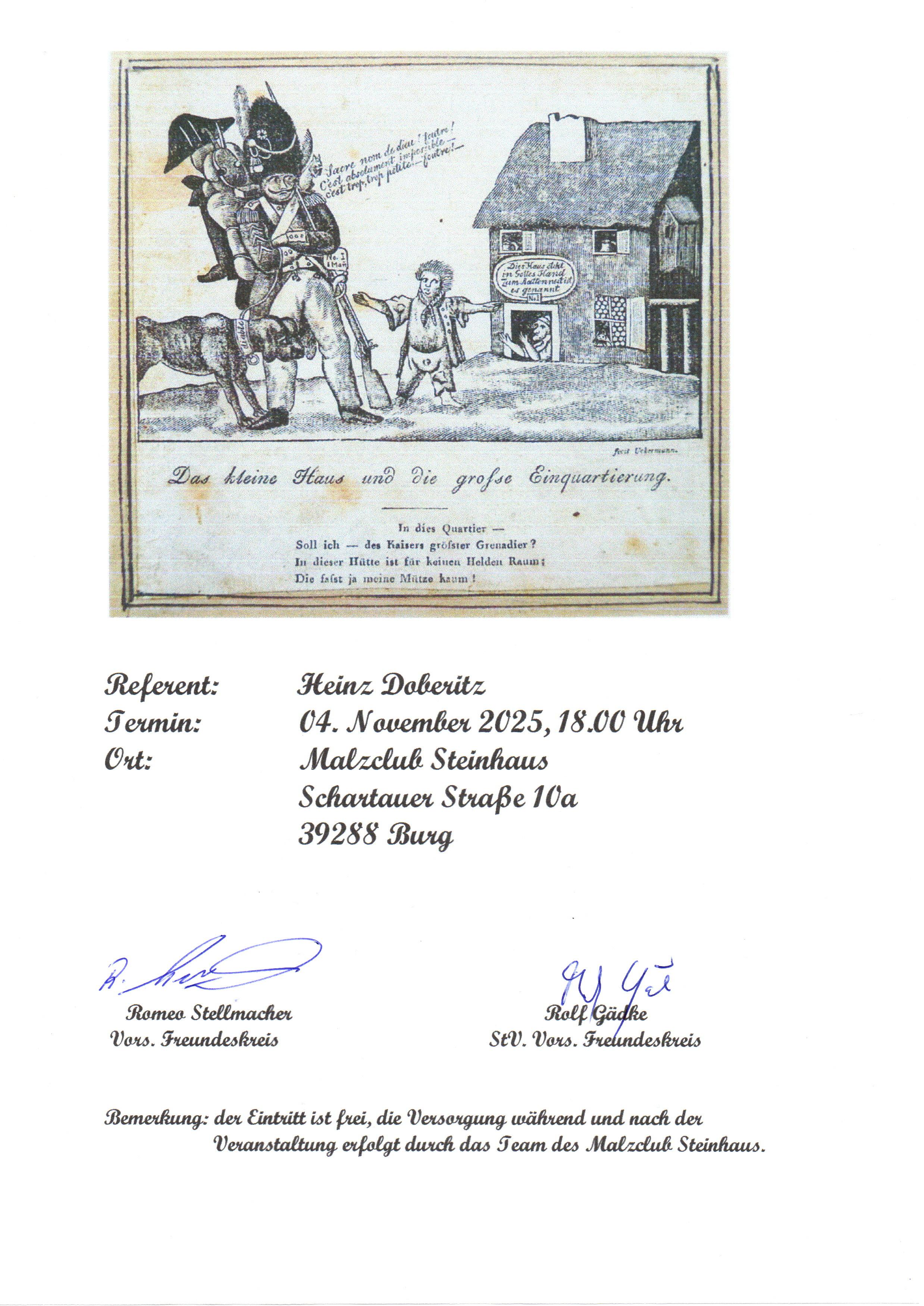 Einladung für den 04.11.2025 zum Vortrag von Heinz Doberitz im Malzclub Steinhaus, Schartauer Straße 10a, 39288 Burg