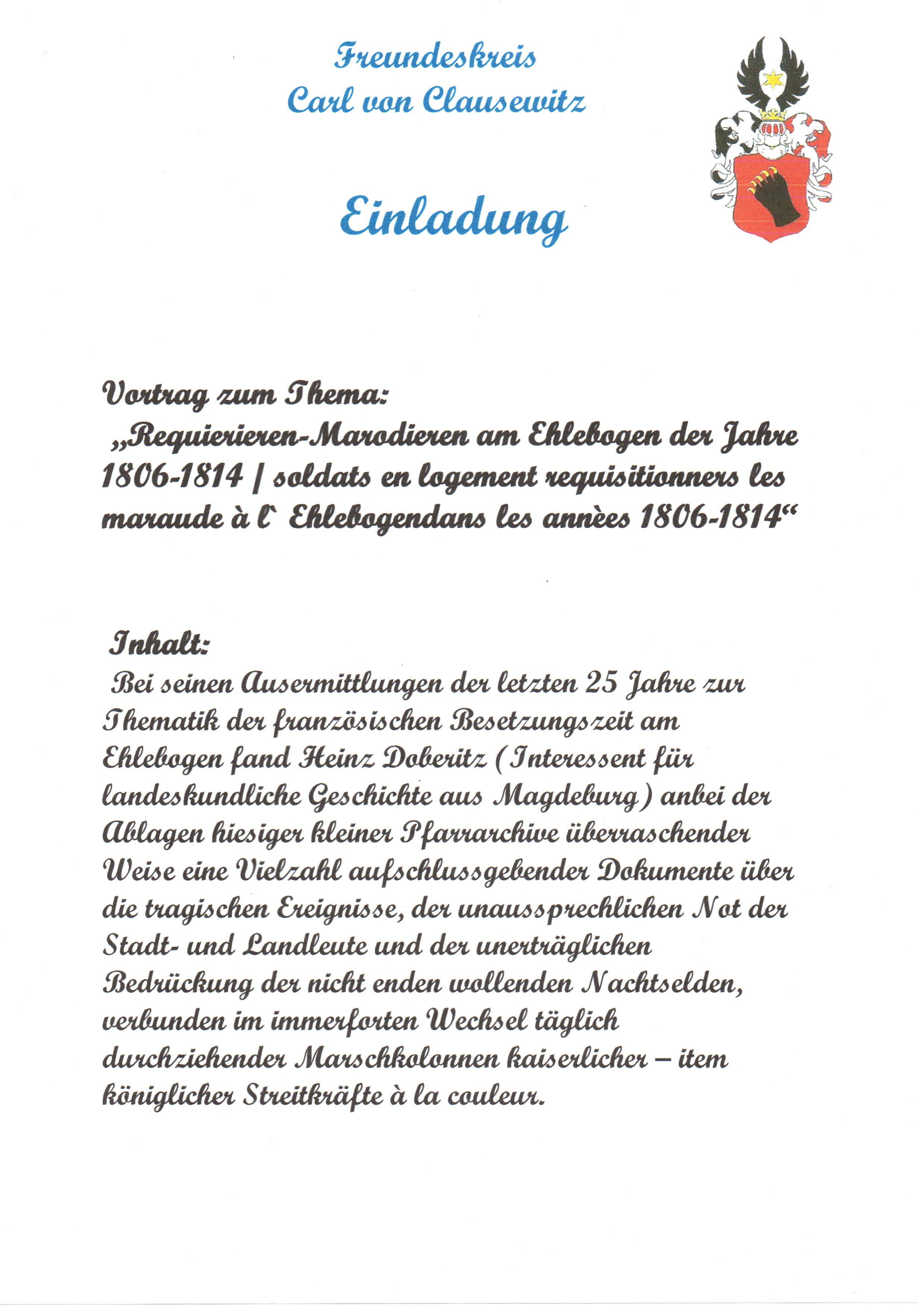 Auch in diesem Jahr setzen wir die Vortragsreihe „Clausewitz – Persönlichkeiten und Ereignisse seiner Zeit“ fort. Gäste der letztjährigen Veranstaltung dürften sich noch gut an die Aussagen unseres Referenten Heinz Doberitz erinnern. In seinem Vortrag geht es erneut um Ereignisse, welche sich in unmittelbarer Nähe ereigneten.