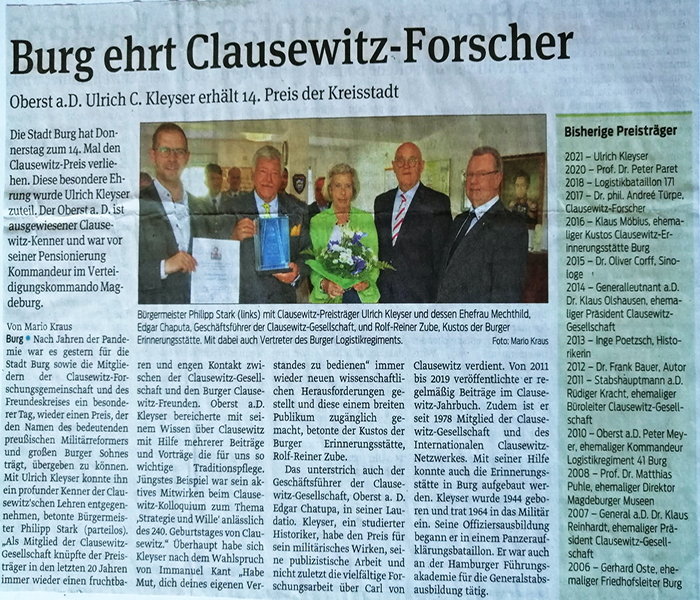Sohn der Stadt Burg bei ihren Einwohnern und allen anderen an Clausewitz interessierten